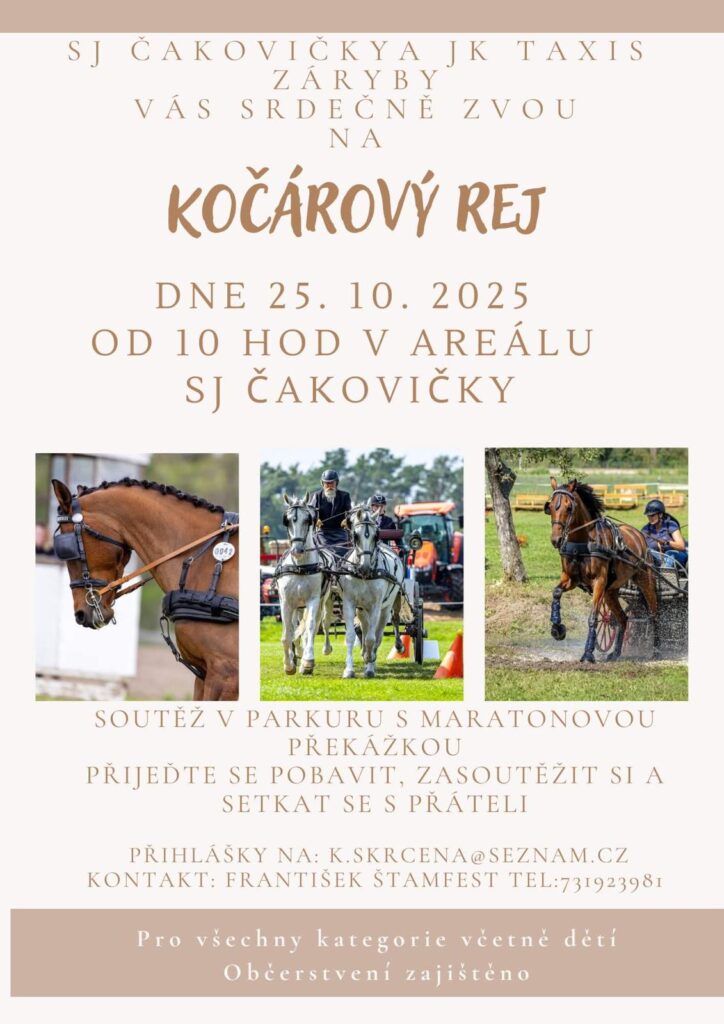 Jezdecký spolek SJ Čakovičky společně s JK Taxis Záryby vás srdečně zve na tradiční Kočárový rej, který se uskuteční v sobotu 25. října 2025 od 10:00 v areálu SJ Čakovičky.